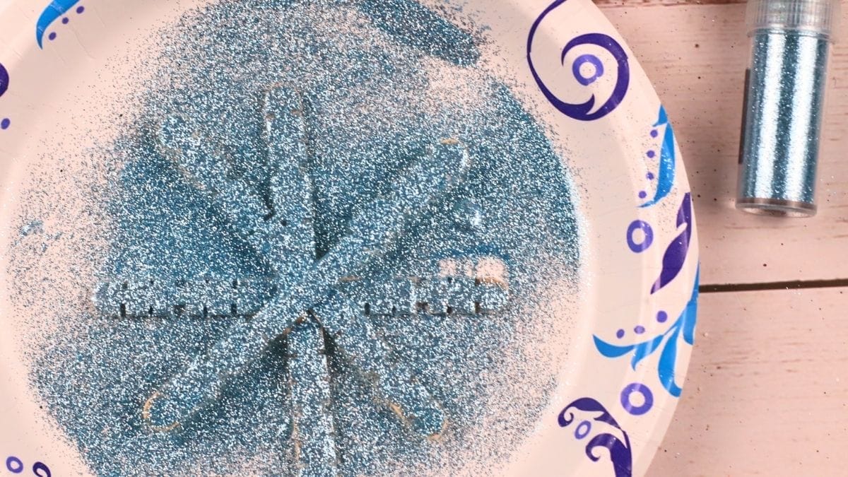 A paper plate with blue glitter, decorated popsicle sticks arranged in a snowflake shape, and a small container of blue glitter on the side—perfect for Snowflake Crafts for Kids.