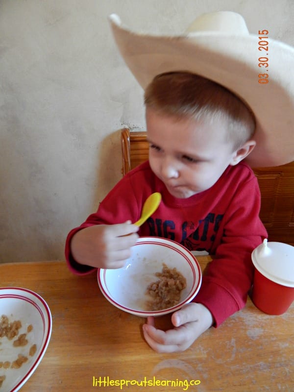 They play with that while I cook their lunch. I serve lunch at 11:30, so they clean up the toys, go potty if they need to and wash their hands. They get their cups of milk and get up to the table. The star of the day prays over the food, I serve them their plates and we eat together again.