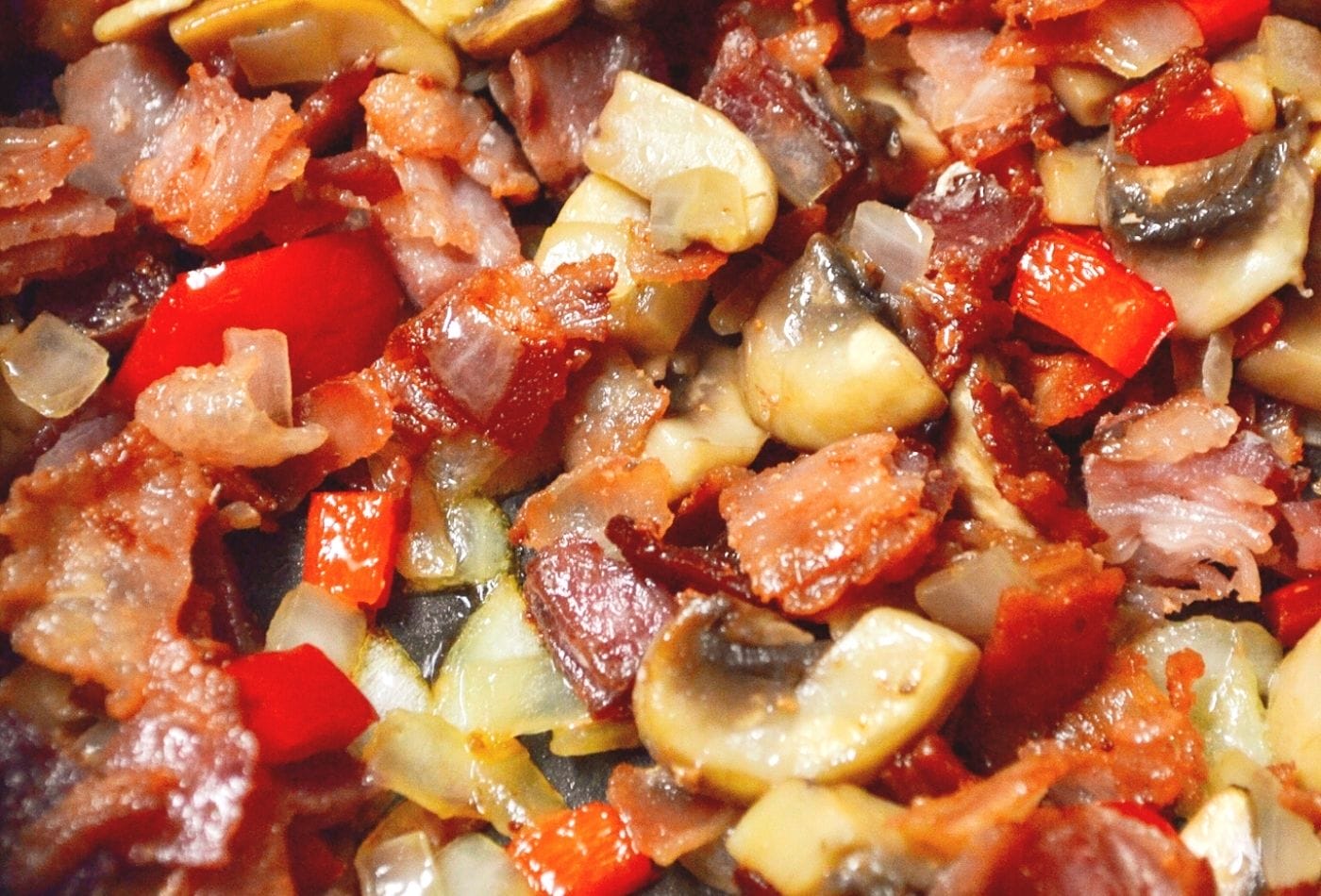 • Using the leftover bacon fat from cooking the bacon, add the onion, red pepper, and mushrooms to the pan. Cook until everything is softened and the onion becomes translucent.