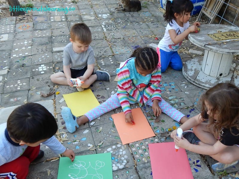 - Make a collage with nature items you find. (one of the ultimate cheap summer activities) Just give the kids paper and glue and let them glue on what they found.