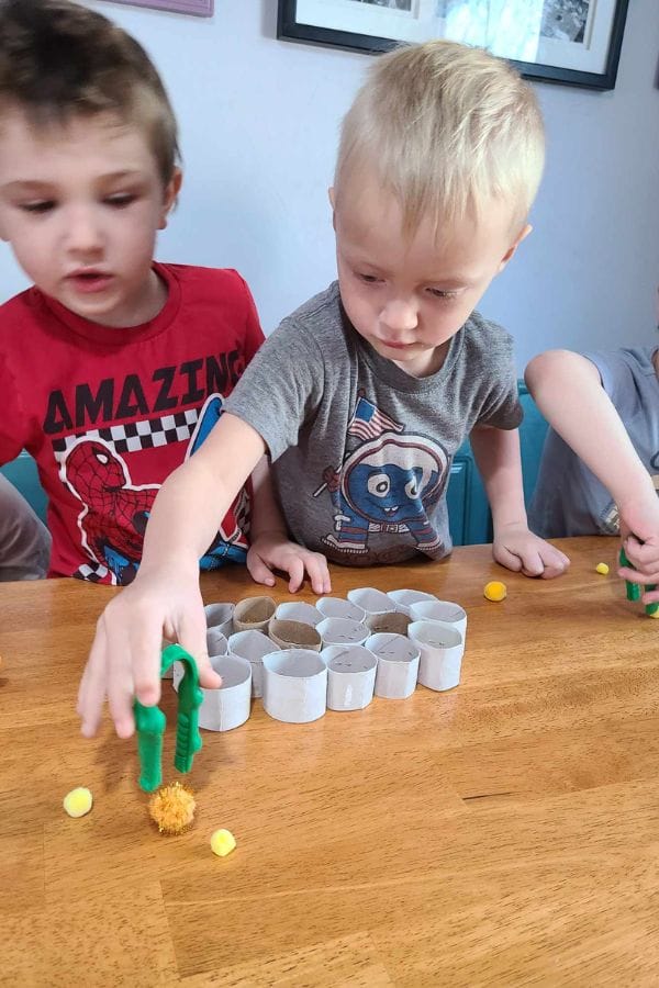 Pom-Pom Bee Transfer: Use tongs to move black and yellow pom-poms from flower cups to an egg carton hive. We use cardboard tubes to make honeycomb shapes, glued them together and did our yellow pom poms with tweezers in that. The kids love it!