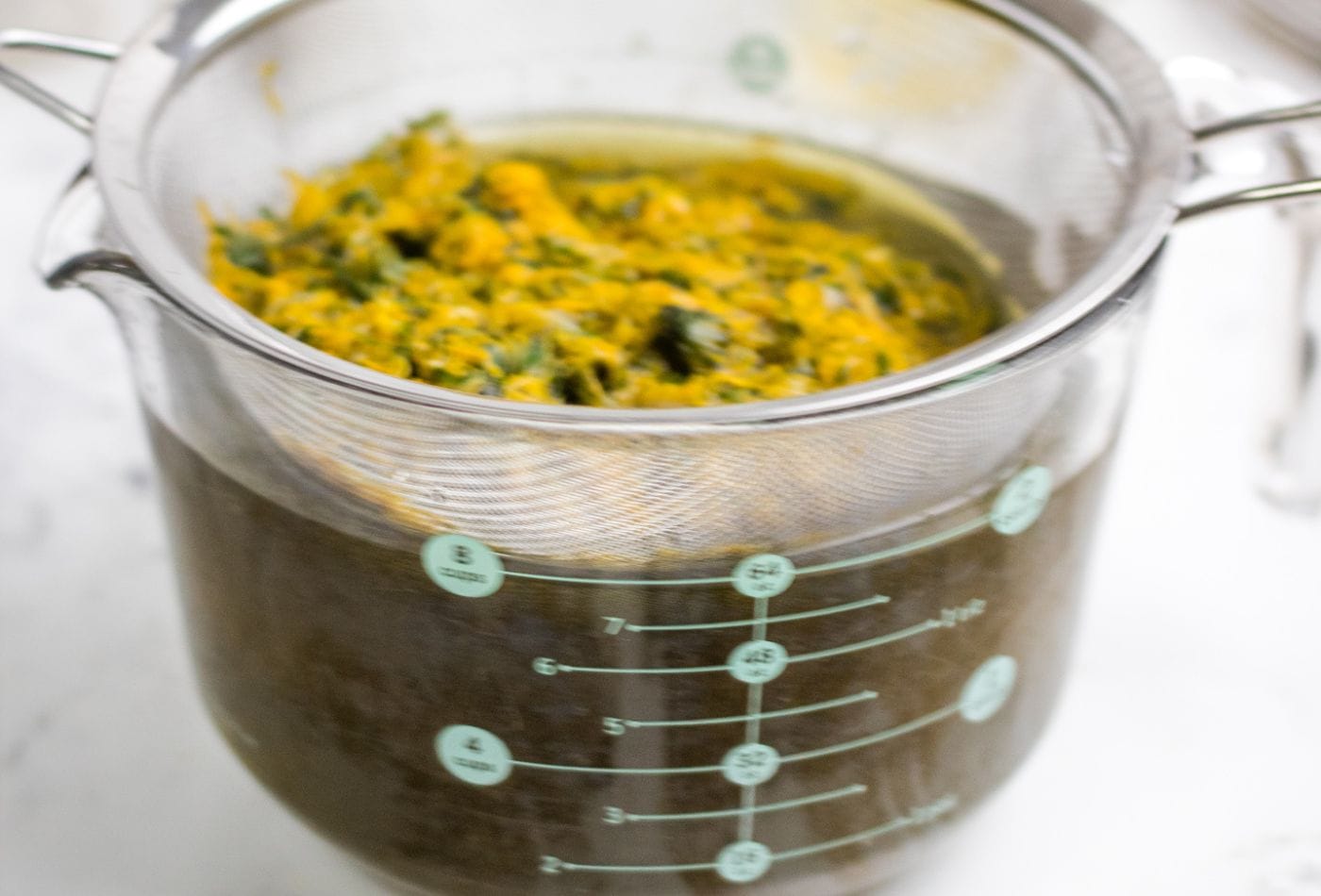 - Strain the flowers from the liquid, using a cheesecloth, strainer or simply squeeze them with your hands. The cheesecloth will result in a clearer jelly but the strainer works just fine.