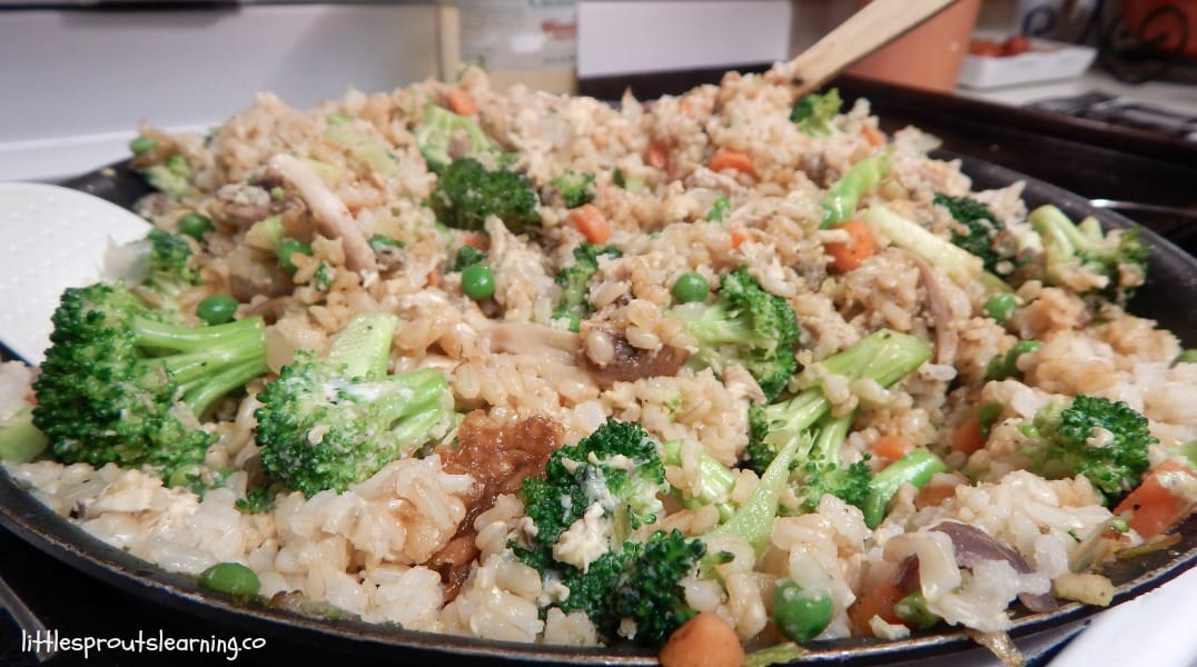 Leftover chicken fried rice is one of our FAVORITE ways to reuse or leftover chicken. It’s fast, it’s full of flavor, and it’s full of veggies.