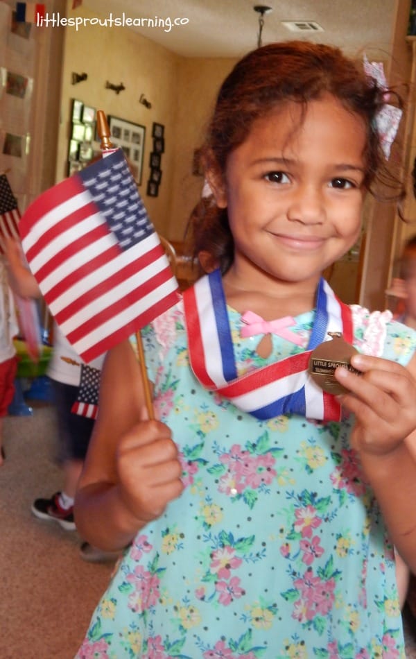 I bought gold medals for each of the kids from a trophy company, but you could easily make them yourself with construction paper, ribbon and cheerios for some rings on the front. We had a medal ceremony for our Olympic activities. I called each child’s name and gave them the medal and then we saluted the flag and sang the National Anthem with Whitney. She knocks it out of the park. The kids love singing our USA song.