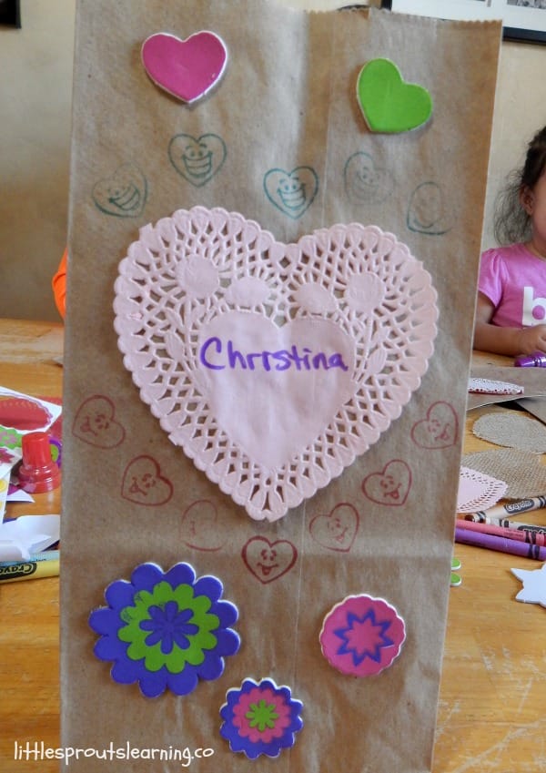 I like to send home a note telling parents the names of the other kids so no one gets left out. Each child needs a “mailbox” for their cards. There are a million ways you can make a Valentine process art container for the kids to trade Valentine’s in. I personally LOVE brown paper sacks because it reminds me of my childhood and brings back some really good memories for me. I usually always use them.